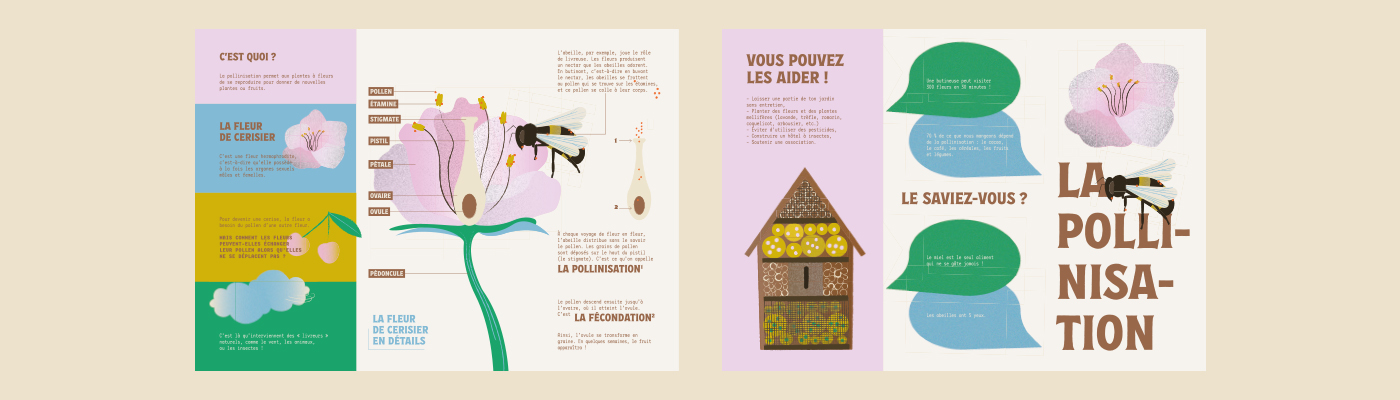 C’est un dépliant informatif pour sensibiliser le public à l’importance de la pollinisation. Ce dernier présente des explications simples sur le rôle crucial des pollinisateurs dans l’écosystème, des conseils pratiques pour protéger et favoriser leur habitat, ainsi que des anecdotes. L’objectif est de rendre le sujet accessible et engageant, en encourageant chacun à contribuer à la préservation de ces espèces indispensables à la biodiversité et à l’agriculture.